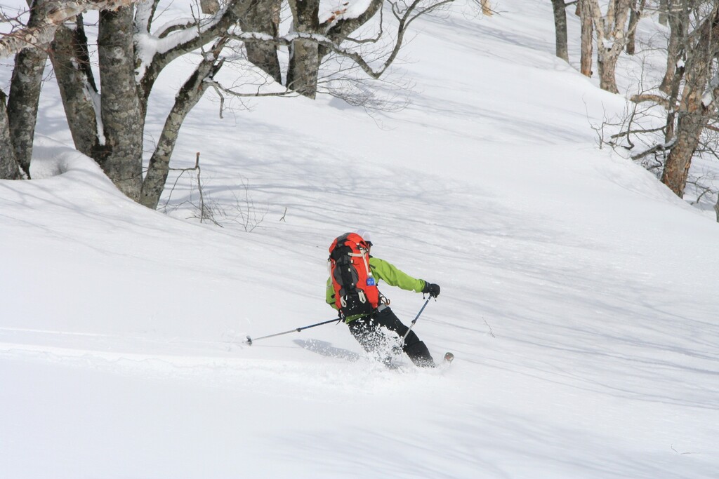 毛無山山頂から千曲川の近くまで、一つの山をゆっくり滑り降りる、スキーを使った旅の感覚が味わえます。